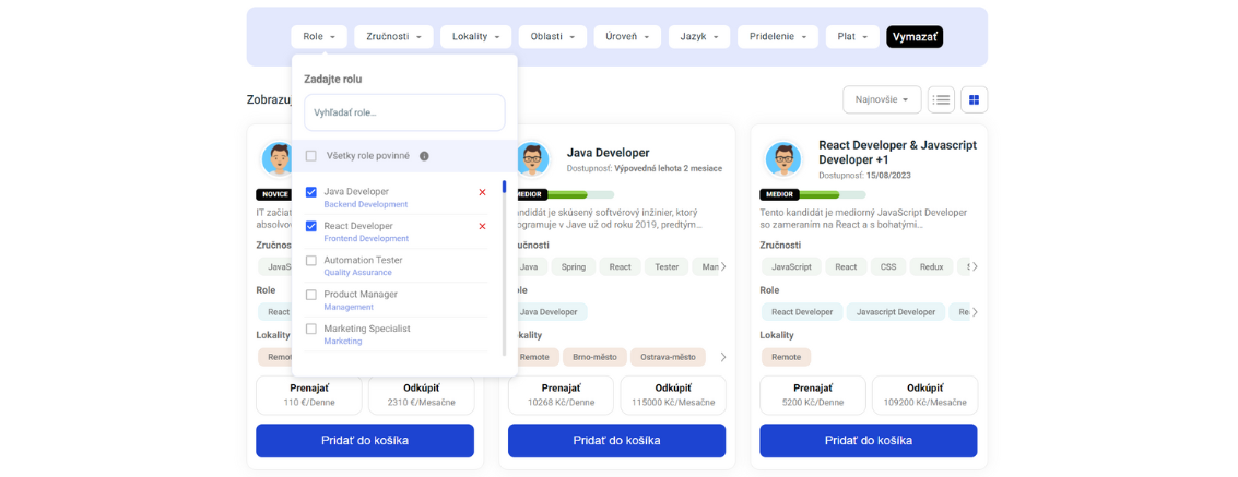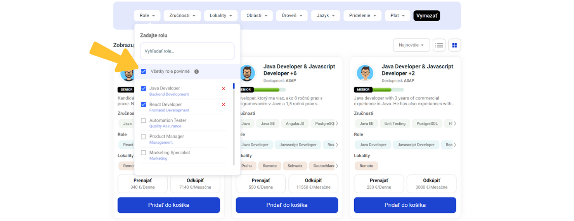 Let's say your new full-stack developer should be proficient in Java with React. Type Java into the search engine and enable the Java Developer role. Likewise, turn on the React Developer role. Now you can see all the verified specialists who work with Java or React. However, not all of them are full-stack developers. Therefore, in the Roles section, click "All roles required" - it is located at the very top.